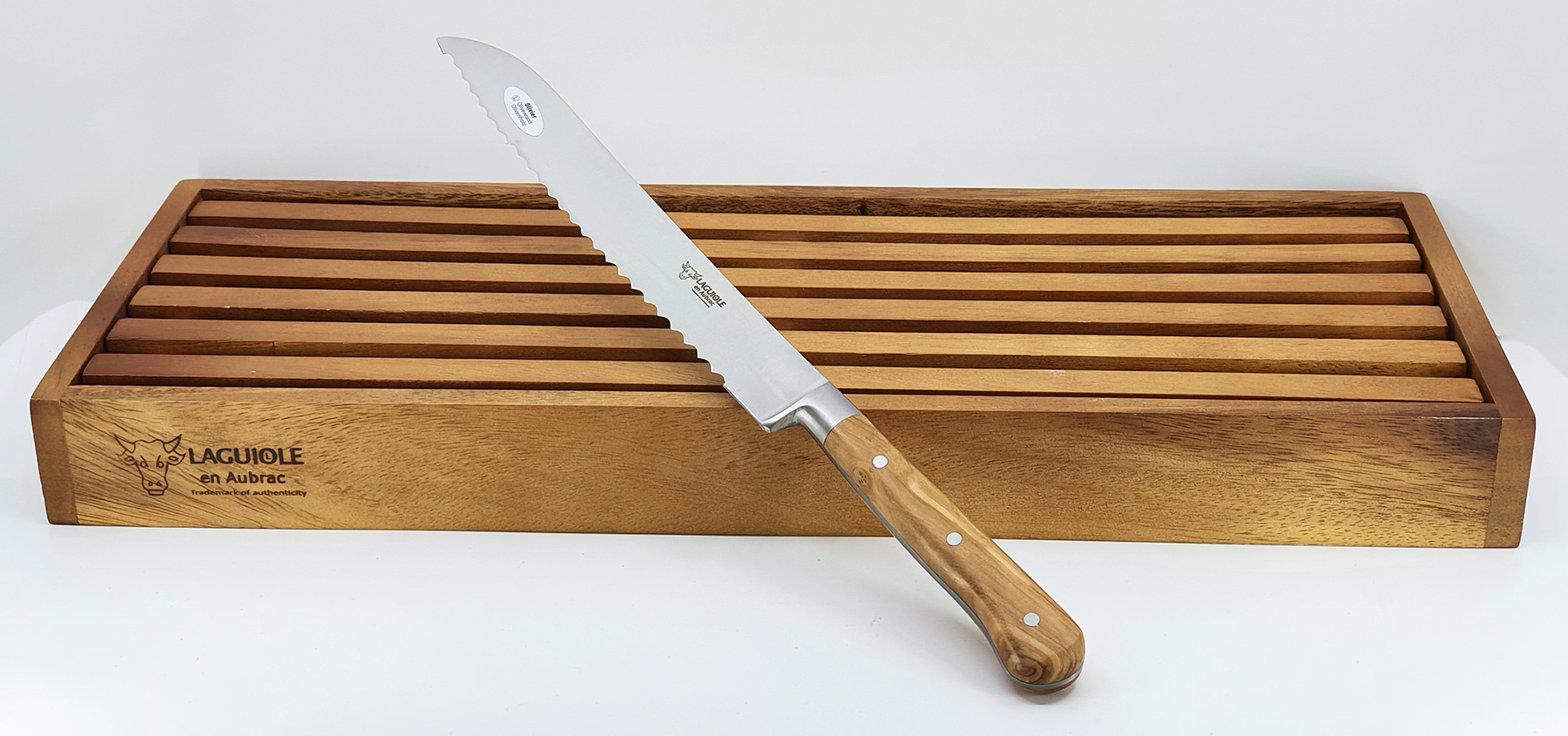 Brotset Laguiole en Aubrac Klassisches Laguiole-Brotmesser mit Olivenholzgriff und Brotbrett