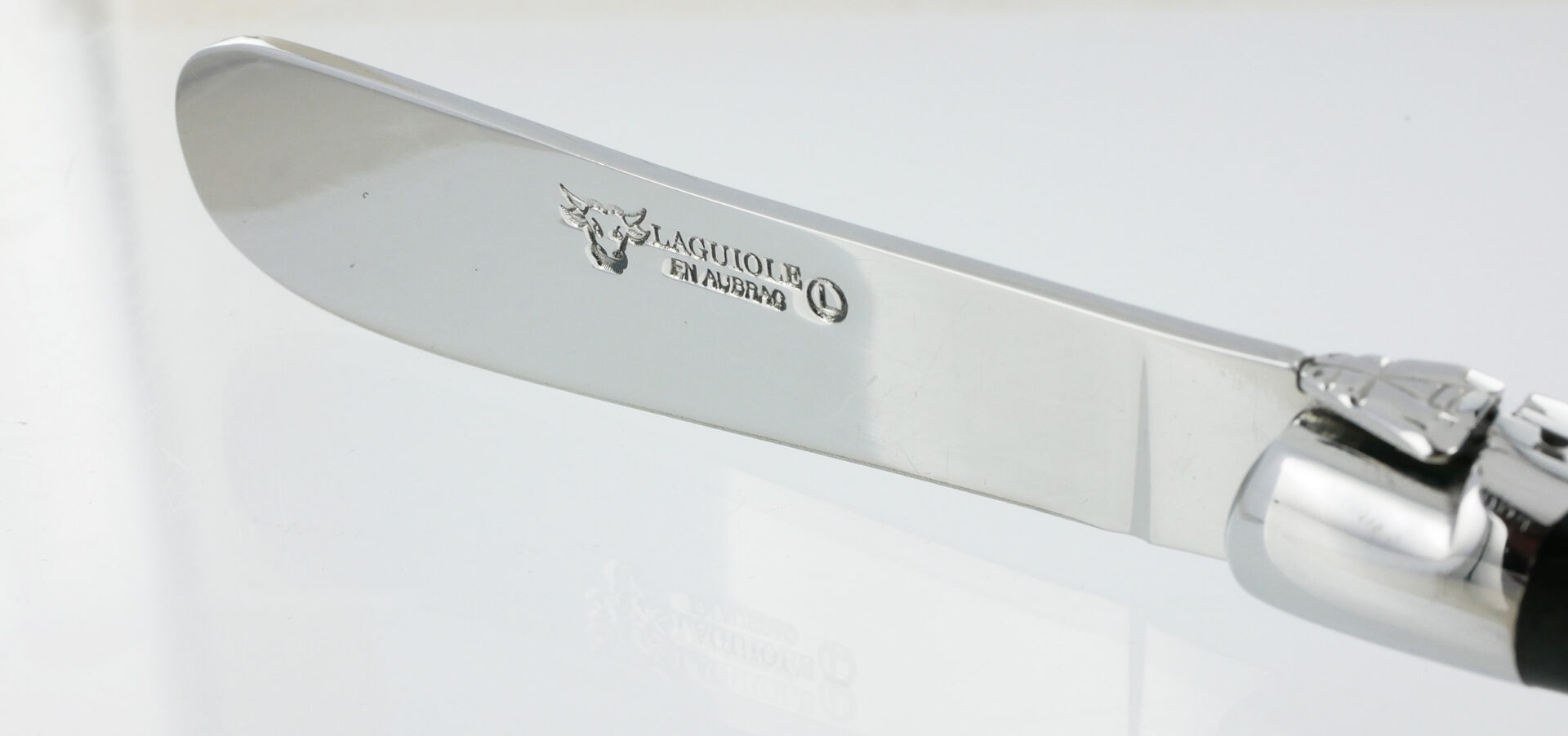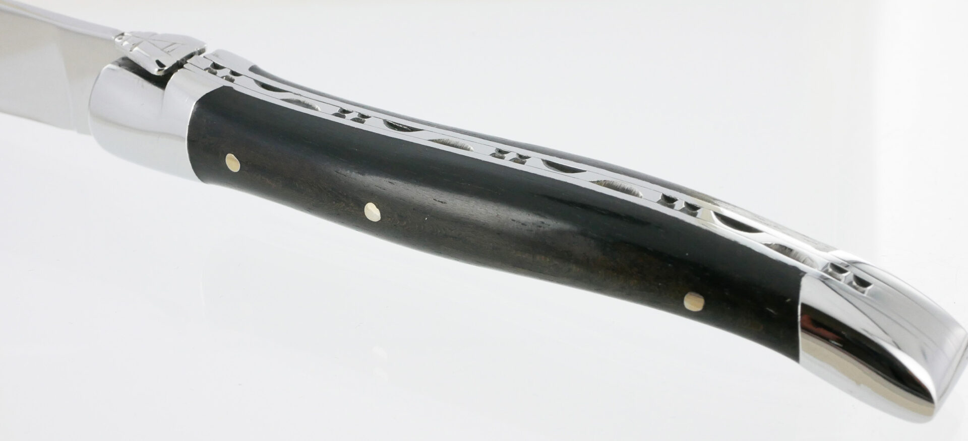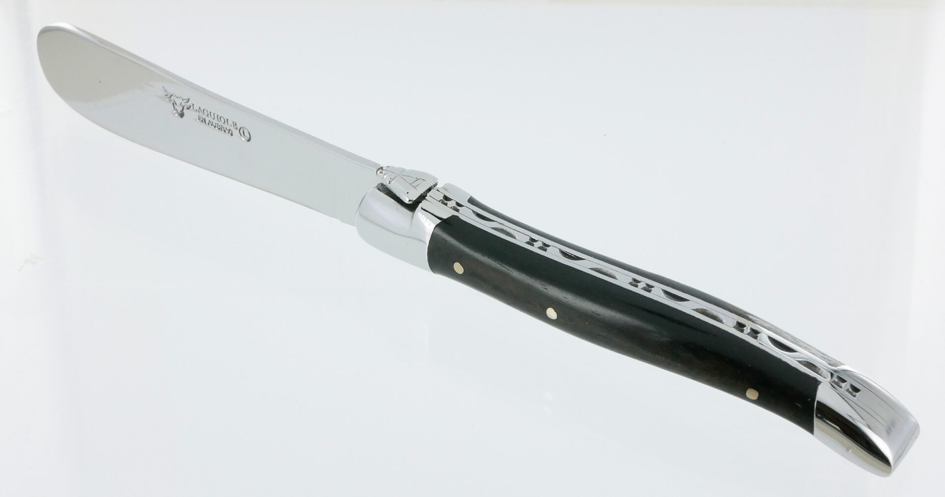 Laguiole en Aubrac stellt ein Buttermesser vor, das mit einem 10 cm langen Griff aus Ebenholz ausgestattet ist und eine Gesamtlänge von 18,5 cm aufweist. Die Klinge besteht aus glänzendem Edelstahl und wird von zwei polierten Edelstahlbacken ergänzt. Der Griff besticht durch kunstvolle, handgeschnitzte Verzierungen entlang seiner Oberseite.
