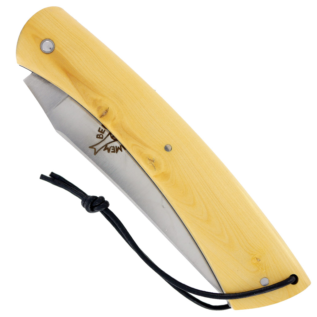 Dieses Messer besticht durch einen vollständigen Griff aus Buchsbaumholz, ergänzt durch eine Lederschnur, die sowohl Stil als auch Funktionalität bietet. Die Klinge besteht aus gebürstetem 12C27-Edelstahl, der für seine Langlebigkeit und Schärfe bekannt ist. Ein erzwungener Kerbenverriegelungsmechanismus sorgt für eine sichere Schließung.