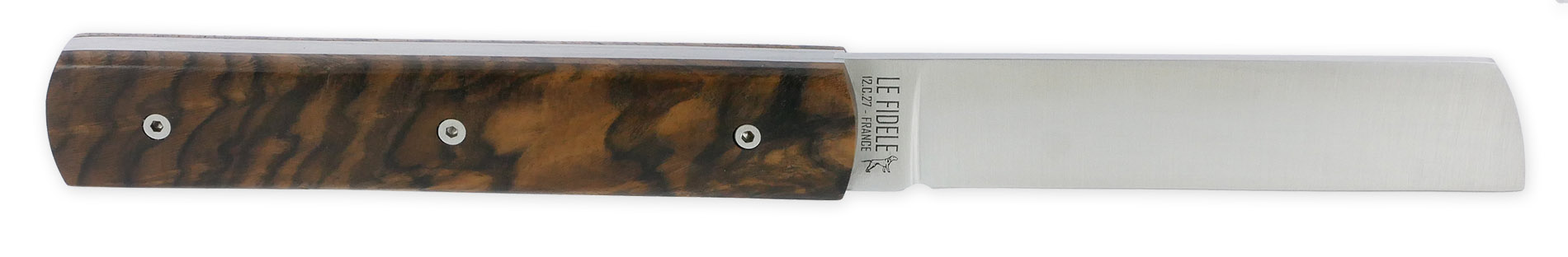 Das 20/20 Klappmesser von Le Fidèle ist ein unverzichtbares Stück für Messerliebhaber. Es besticht durch einen Griff aus massivem Walnussholz, der individuell mit Gravuren auf der Klinge oder der Feder versehen werden kann. Der Griff hat eine Länge von 10,8 cm und eine Breite von 4 mm, was für eine angenehme Handhabung sorgt. Die Klinge besteht aus gebürstetem 12C27-Edelstahl und zeichnet sich durch ein gerades Design mit abgerundeter Spitze aus. Sie misst 9,2 cm in der Länge und 2,5 mm in der Breite. Mit einem Gewicht von nur 89 Gramm ist das Messer sowohl leicht als auch funktional.