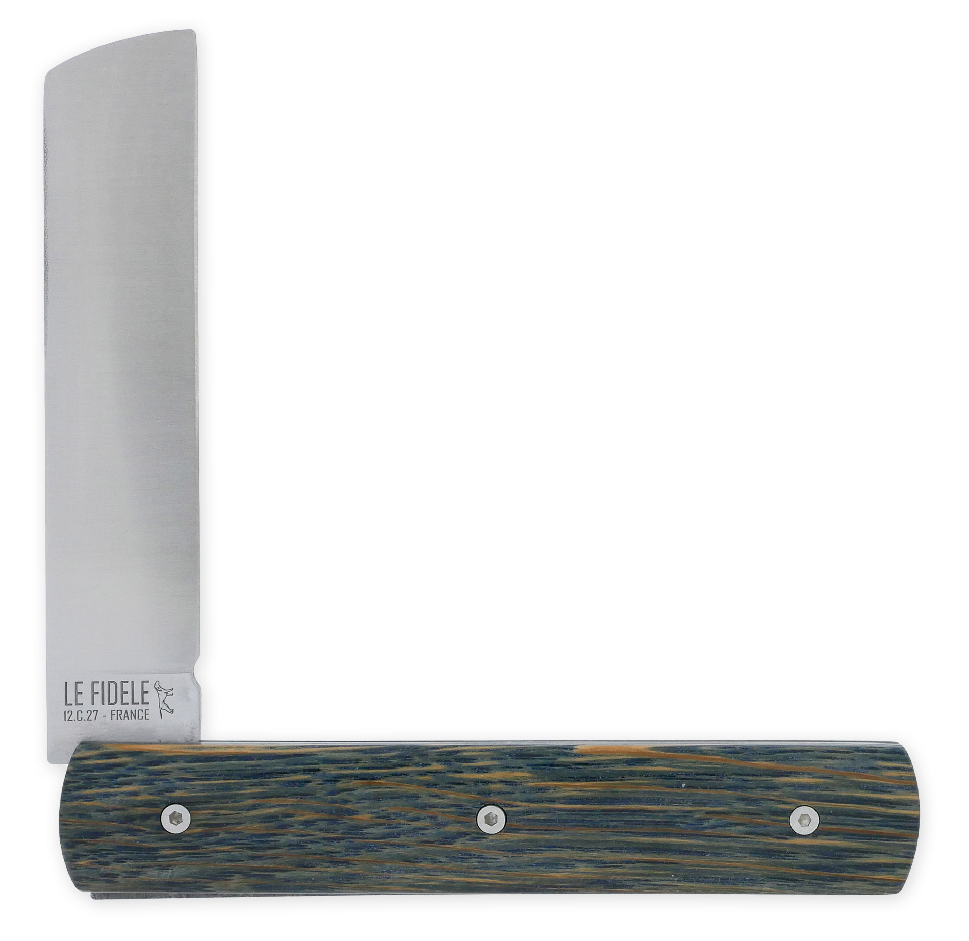 Das 20/20 Klappmesser von Le Fidèle beeindruckt mit einem Griff aus blau gefärbter, stabilisierter Eiche, der die Möglichkeit für individuelle Gravuren auf Klinge und Feder bietet. Der Griff hat eine Länge von 10,8 cm und eine Breite von 4 mm. Ausgestattet ist das Messer mit einer Klinge aus 12C27 Edelstahl, die durch ihre gerade Schneide und abgerundete Spitze besticht. Die Klinge misst 9,2 cm in der Länge und 2,5 mm in der Breite. Das gesamte Messer wiegt 89 Gramm.