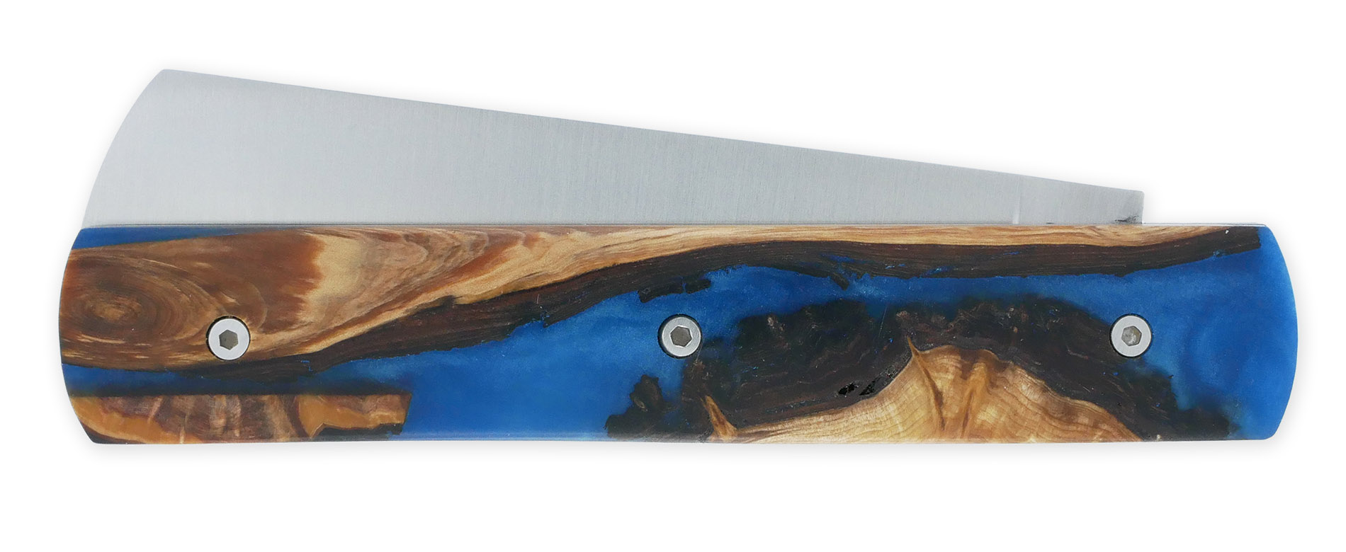Vorstellung des Le 20/20 Klappmessers von Le Fidèle, ein unverzichtbares Stück für Messerliebhaber. Dieses exquisite Messer besticht durch einen Griff aus vollständig erhaltenem Wacholderholz, das elegant in Blau getönt ist. Für eine persönliche Note kann der Griff mit Gravuren auf der Klinge oder der Feder individuell gestaltet werden.