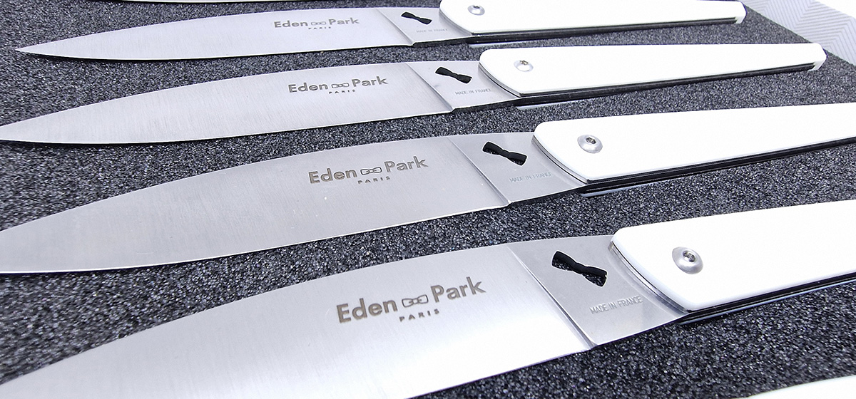 Diese Messer sind ein Muss für Kenner, da sie das charakteristische Eden Park Fliegendesign auf der Klinge tragen. Jedes Messer verfügt über einen weißen Acrylgriff von 11,4 cm, der perfekt mit der 11,4 cm langen Klinge ausbalanciert ist, was eine Gesamtlänge von 22,8 cm ergibt. Mit einem Gewicht von 65 Gramm bieten diese Messer ein komfortables und präzises Schneiderlebnis.