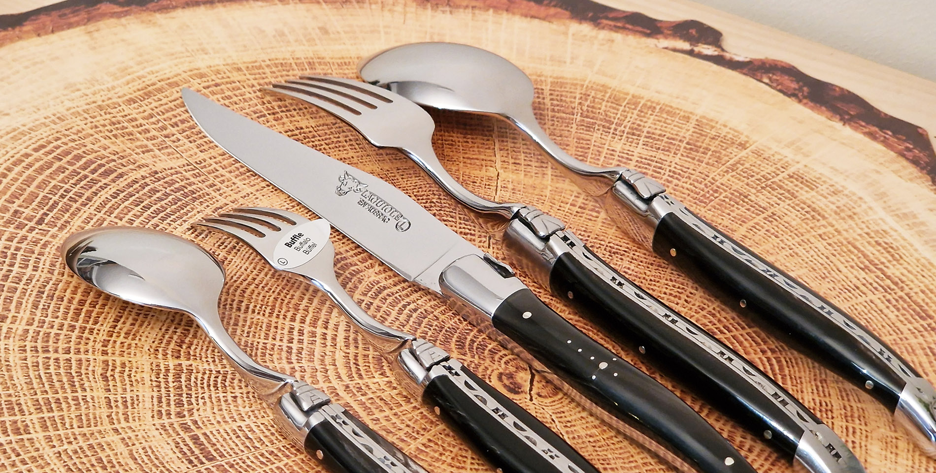 Die polierten Büffelhorn-Griffe verleihen dem Set eine elegante Note. Die Klingen, Gabeln, Löffel, Backen und Platinen bestehen aus erstklassigem Edelstahl. Das Set umfasst ein Tafelmesser, eine Gabel, einen Suppenlöffel, eine Dessertgabel und einen Dessertlöffel, wobei der Messergriff mit der charakteristischen Schäferkreuz-Gravur versehen ist.