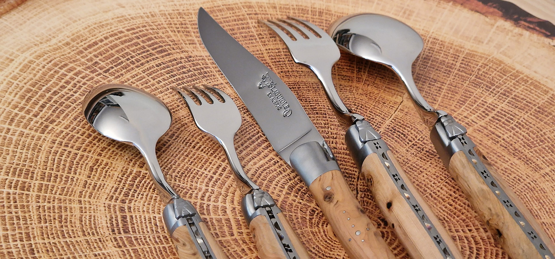 Das von Ihnen beschriebene Besteckset ist ein wahres Meisterwerk der Kunstfertigkeit von Laguiole en Aubrac, bekannt für seine herausragende Handwerkskunst. Jedes Stück wird mit höchster Präzision von Hand gefertigt und verfügt über Griffe aus edlem Wacholderholz, das nicht nur eine warme, natürliche Optik bietet, sondern auch einen angenehmen Halt gewährleistet. Die Einzigartigkeit jedes Griffs, die sich aus den natürlichen Eigenschaften des Holzes ergibt, verleiht dem Set eine authentische Note.