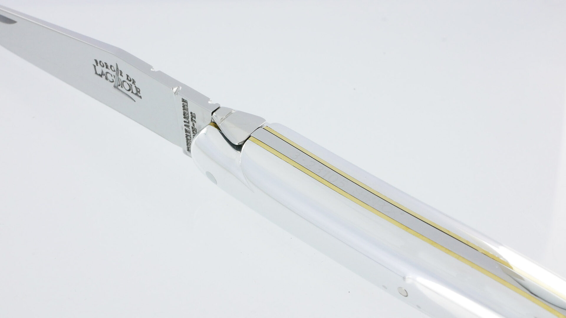Dieses Messer beeindruckt mit einem Aluminiumgriff und einem durchgehenden Kanaldesign. Die glänzende Klinge aus Edelstahl wird durch Messingplatinen ergänzt. Der sanfte Federmechanismus trägt die Signatur des Designers und verleiht dem Messer eine exklusive Note. Ein geschmiedetes Fliegenmotiv, ein charakteristisches Merkmal der Laguiole-Handwerkskunst, ist ebenfalls enthalten. Die Klinge misst 9 cm, während das Messer im geöffneten Zustand eine Gesamtlänge von 20 cm und im geschlossenen Zustand 11 cm erreicht.