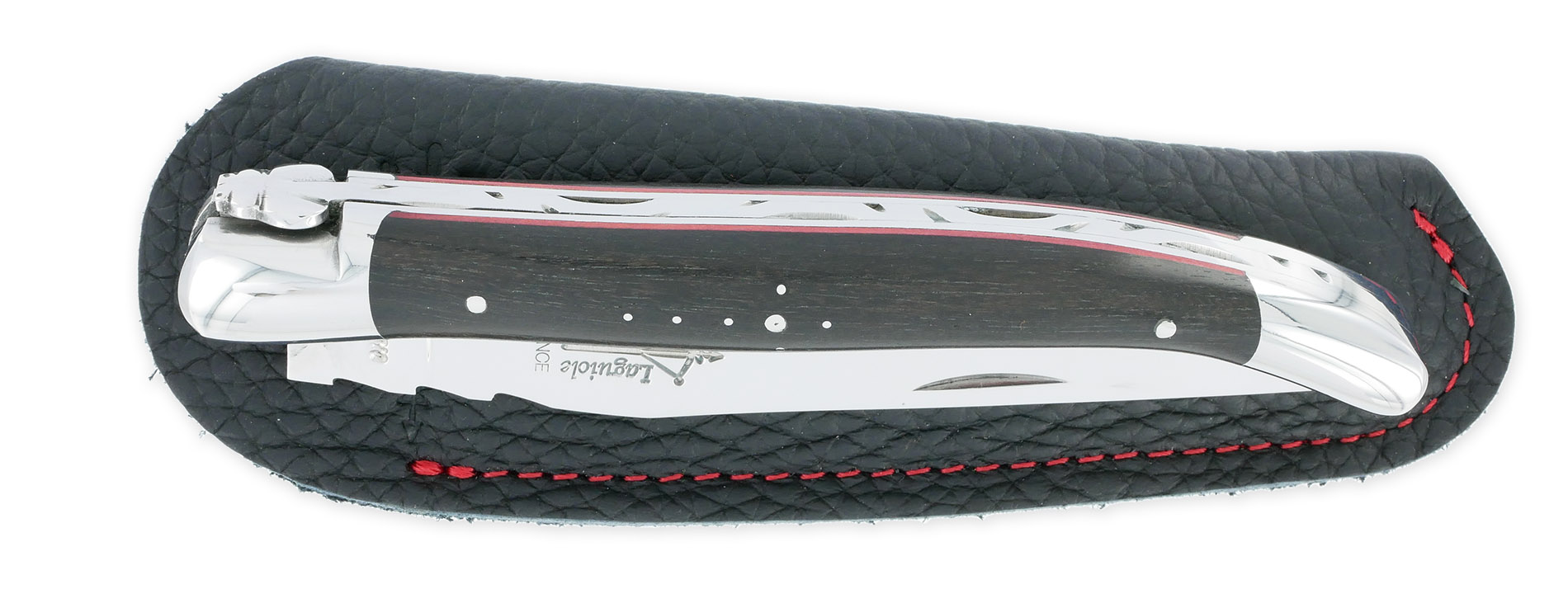 Laguiole Arbalète Messer Ebenholzgriff 2 Helle Edelstahlbacken Rote Abstandshalter 1 Stück 12cm