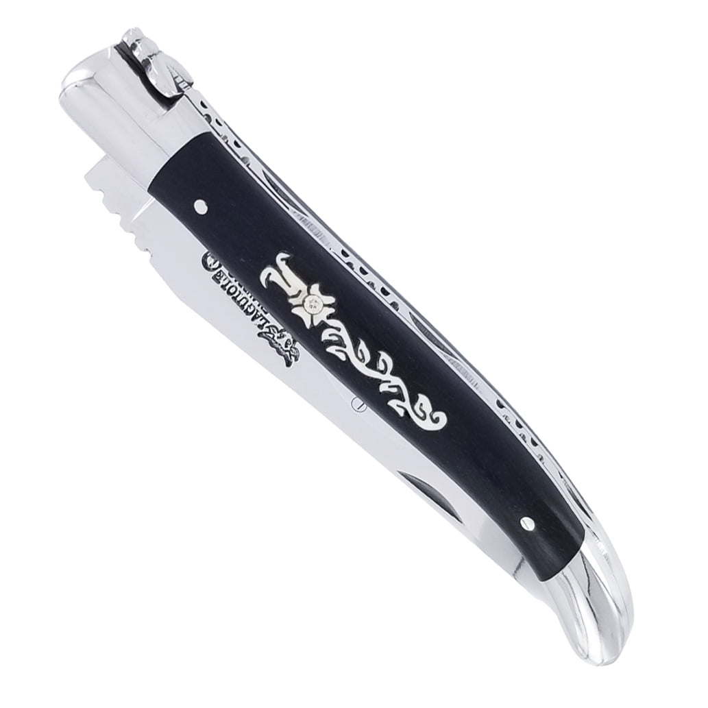 Das Laguiole en Aubrac Messer besticht durch zwei polierte Edelstahlbacken und eine Klinge aus 12C27MOD-Stahl mit glänzendem Finish. Der Griff besteht aus Ebenholz, verziert mit Mammutelfenbein und Diamanteinlagen, und zeigt eine kunstvolle Mammutelfenbein-Blumenintarsie. Charakteristisch ist die ikonische geschmiedete Biene und die fein von Hand gravierte Feder. Im geschlossenen Zustand misst das Messer 12 cm, geöffnet erreicht es eine Länge von 22 cm, wobei die Klinge 10 cm lang ist.