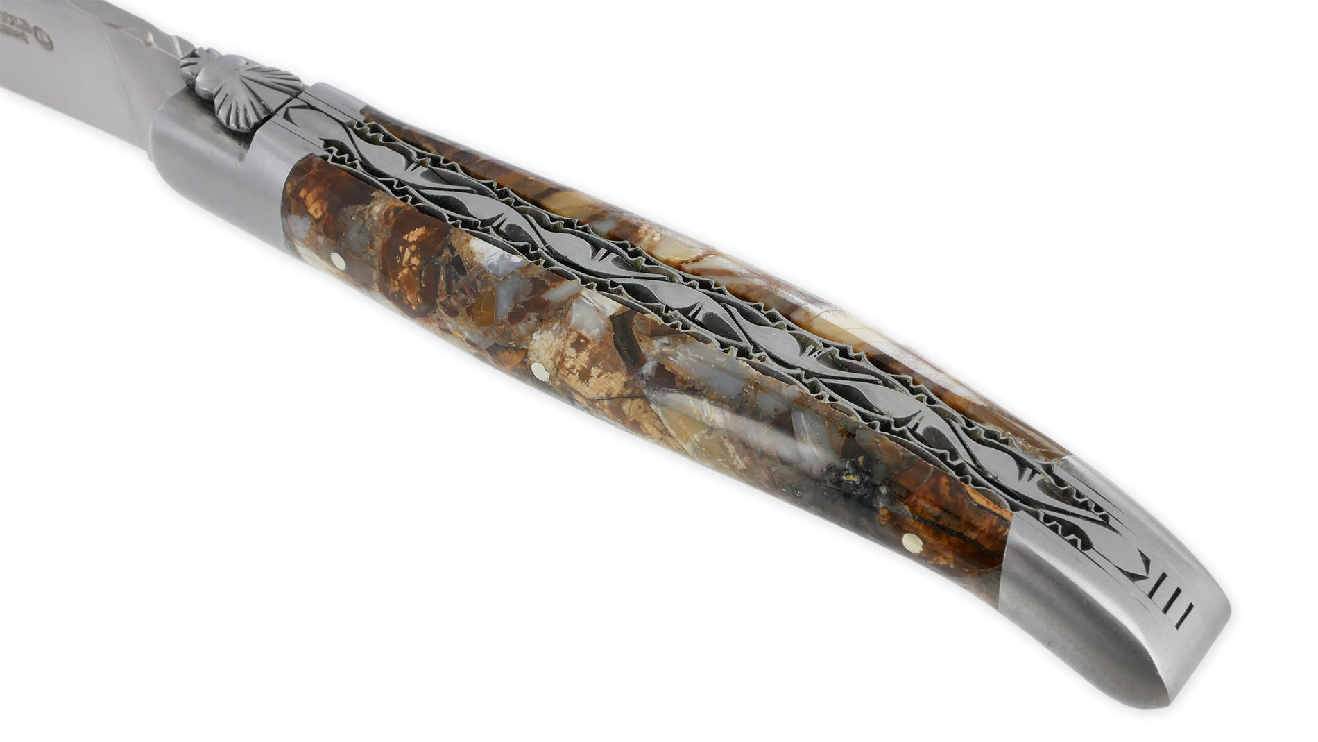 Das Laguiole en Aubrac Klappmesser N°2 beeindruckt mit einem Griff aus stabilisiertem Mammutmaterial und zwei gebürsteten Edelstahlbacken. Die Klinge besteht aus gebürstetem 12c27 Edelstahl und wird durch eine handgeschnitzte Feder ergänzt, die sowohl die Ästhetik als auch die Funktionalität verbessert. Das Messer verfügt zudem über doppelt gebürstete Edelstahlplatinen, die sorgfältig von Hand geschnitzt und gemeißelt wurden, um eine einzigartige Note zu verleihen. Eine handgeschmiedete Fliege unterstreicht das unverwechselbare Design. Die Klinge misst 10 cm, während das Messer im geschlossenen Zustand 12 cm und im geöffneten Zustand 22 cm lang ist.