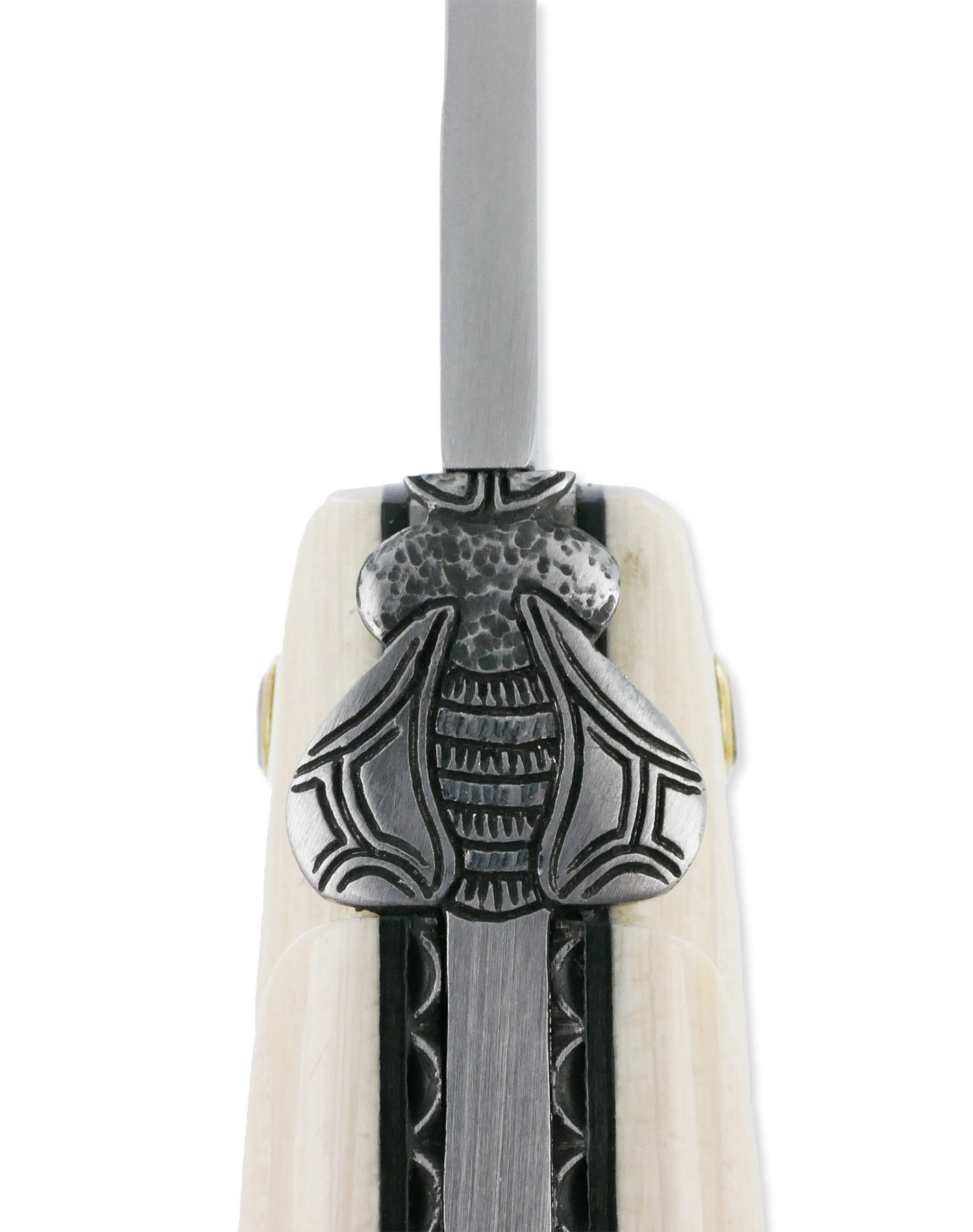Dieses außergewöhnliche Klappmesser besticht durch einen Griff aus Mammutelfenbein, der auf der linken Seite mit dem ikonischen Hirtenkreuz verziert ist. Schwarze vulkanisierte Zellulosefaser-Abstandshalter sorgen für zusätzliche Robustheit. Die Klinge besteht aus gebürstetem 12C27 MOD Edelstahl und ist mit einem Tab für einfache Handhabung ausgestattet. Die Feder des Messers zeigt ein fein handgemeißeltes Laubmuster, während die gebürsteten Edelstahlplatinen sowohl handgeschmiedet als auch kunstvoll verziert sind. Die Prestige Fly N°3, ebenfalls handgeschmiedet und gemeißelt, verleiht dem Messer eine elegante Note. Dieses Unikat hat eine Klingenlänge von 10 cm, eine geschlossene Länge von 12 cm und eine offene Länge von 22 cm.