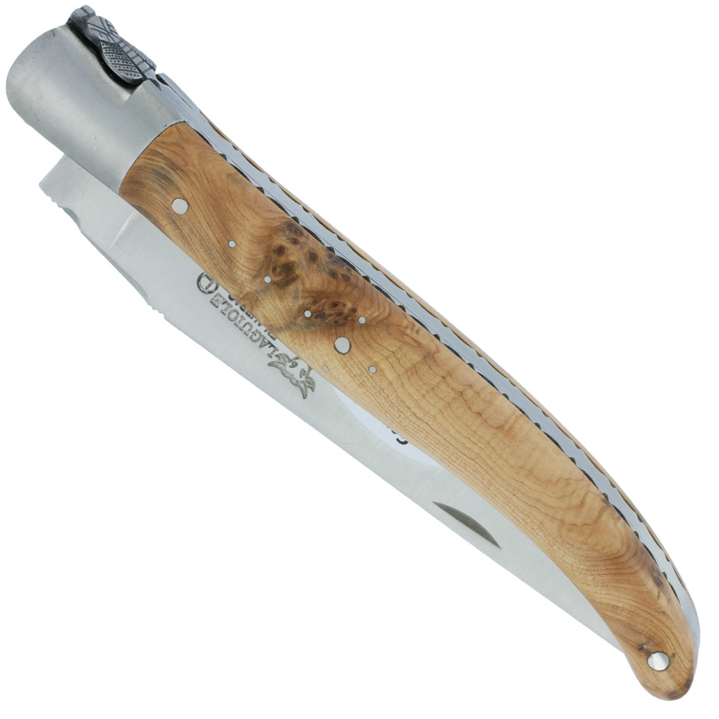 Dieses Messer besticht durch einen Griff aus Wacholderholz und einen einzelnen mattierten Edelstahlbacken. Die Klinge, ebenfalls aus gebürstetem Edelstahl gefertigt, verfügt über einen praktischen Öffnungsmechanismus. Der sanfte Federmechanismus kann individuell per Lasergravur gestaltet werden. Die Konstruktion des Messers wird durch geschmiedete und von Hand verzierte Edelstahlplatinen verstärkt. Eine charakteristische, handgeschmiedete Biene verleiht dem Messer eine besondere Eleganz. Die Klinge misst 10 cm, während das Messer im geschlossenen Zustand 12 cm und im geöffneten Zustand 22 cm lang ist.