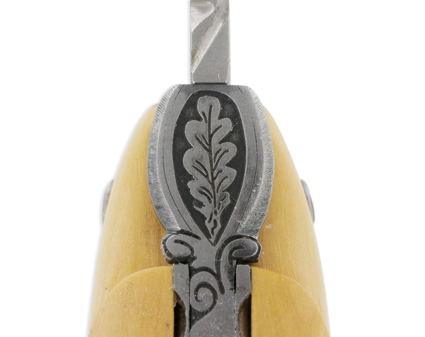 Verzierungen: Handgeschmiedete und gravierte Eichenblatt-Fliege aus gebürstetem Edelstahl