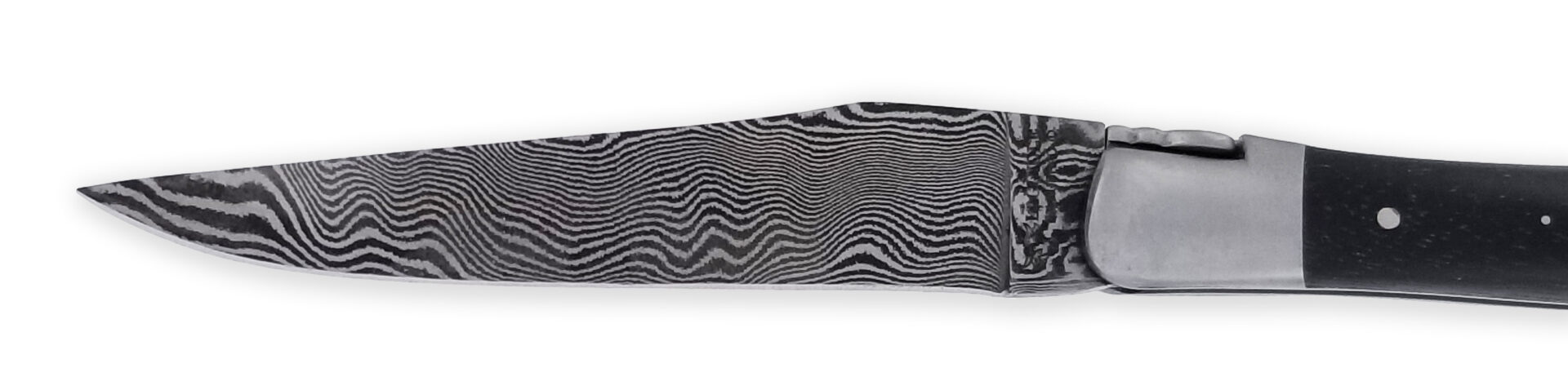 Das Laguiole en Aubrac Balbach Klappmesser überzeugt durch herausragende Schneidleistung, eine feine Struktur und beeindruckende Härte nach dem Härten, die bis zu 63 HRC erreicht. Der verwendete Kohlenstoff-Damaststahl ist während der Wärmebehandlung formbeständig. Er besteht aus 90McV8 (O2), bekannt für seine tiefschwarzen Töne, und 45NCD16 mit 4% Nickel, was zu auffallend kontrastreichen Mustern führt.
