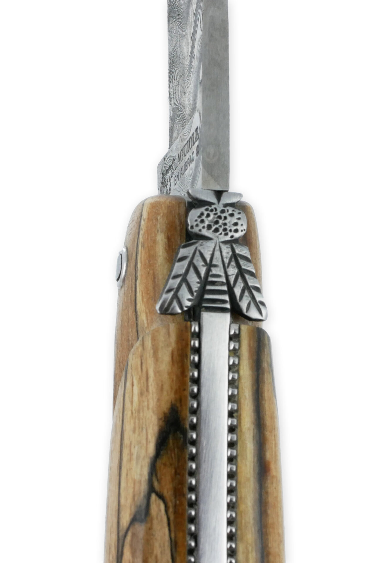 Der Griff aus Aubrac-Holz verleiht dem Messer zusätzliche Raffinesse, wobei die natürlichen Farbtöne und Maserungen eine zeitlose und einzigartige Eleganz ausstrahlen. Die Prestige-Fliege Nr. 12 hebt die Damaststahlklinge weiter hervor und unterstreicht die handwerkliche Kunstfertigkeit, die mit Laguiole verbunden ist.