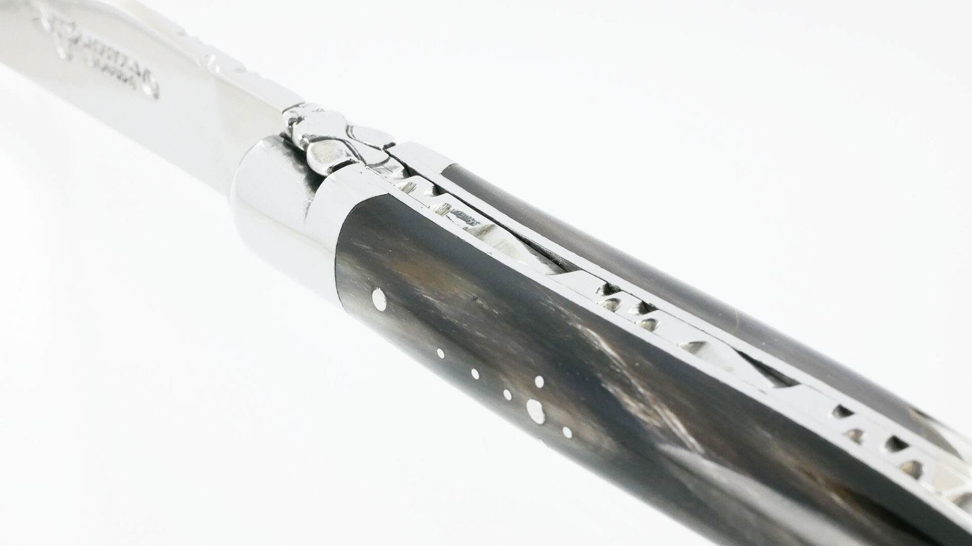 Laguiole en Aubrac Messer mit einem Griff aus Büffelhorn und doppelt polierten Edelstahlbacken. Es zeichnet sich durch eine geschmiedete Biene und eine handgeschnitzte Feder aus. Das Messer ist im geschlossenen Zustand 10 cm lang, die Klinge misst 9 cm, und es erreicht eine Gesamtlänge von 19 cm im geöffneten Zustand.