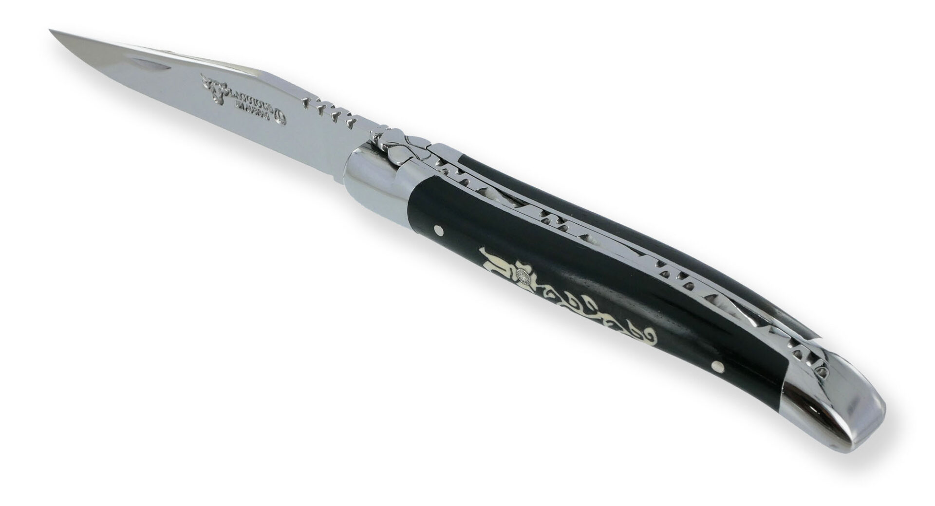 Laguiole en Aubrac Messer 1 Stück Intarsien Ebenholzgriff Diamanteinlage 2 glänzende Edelstahlbacken 10 cm