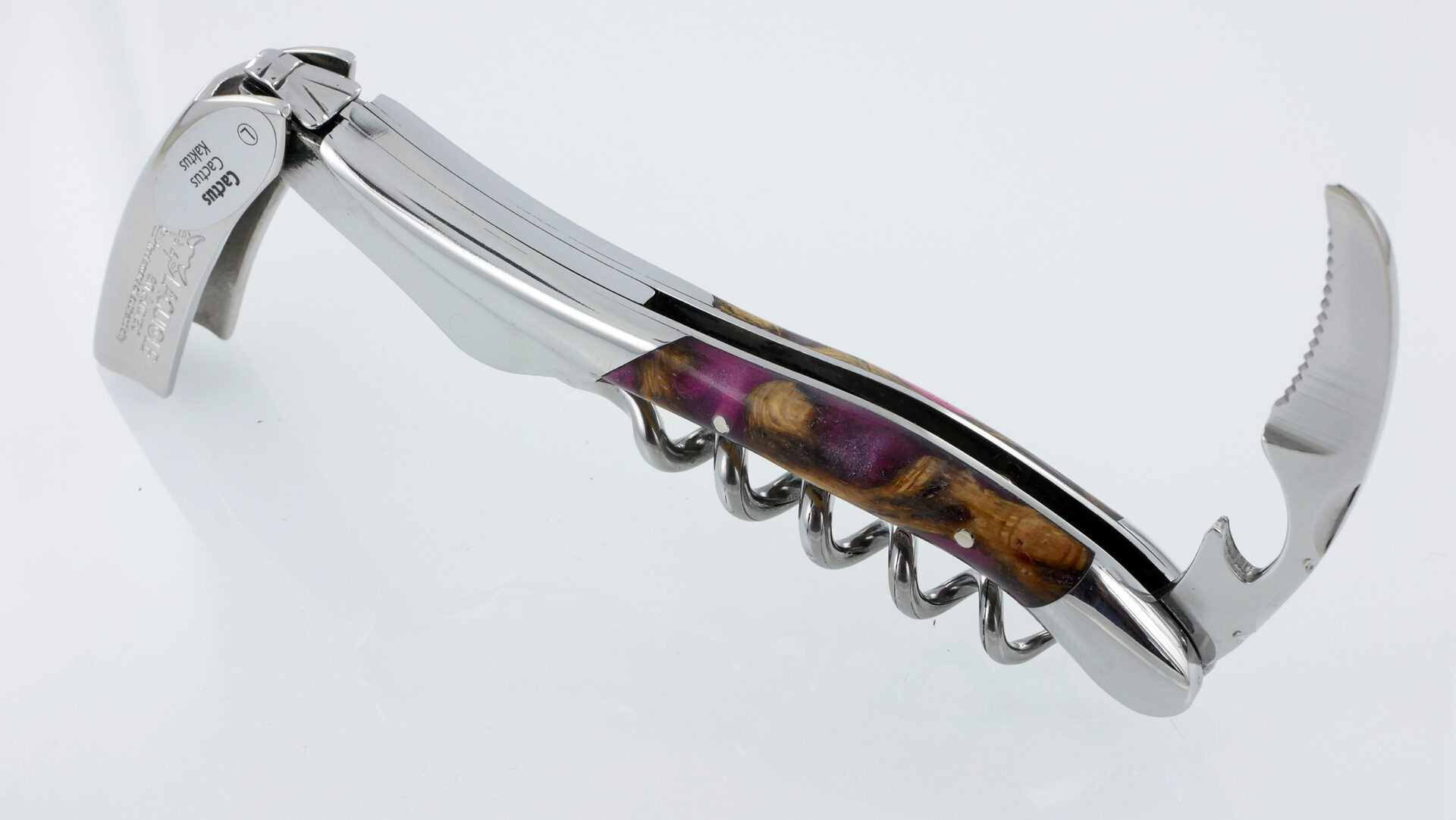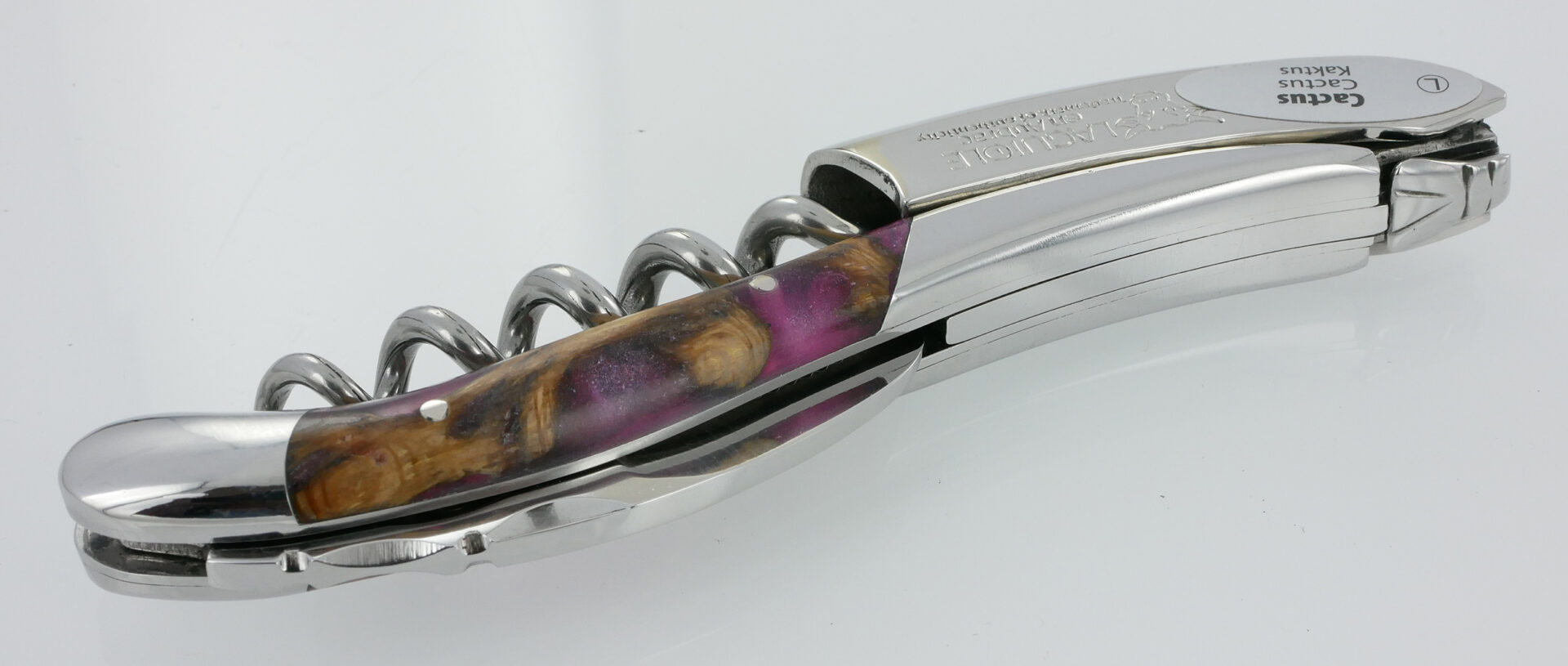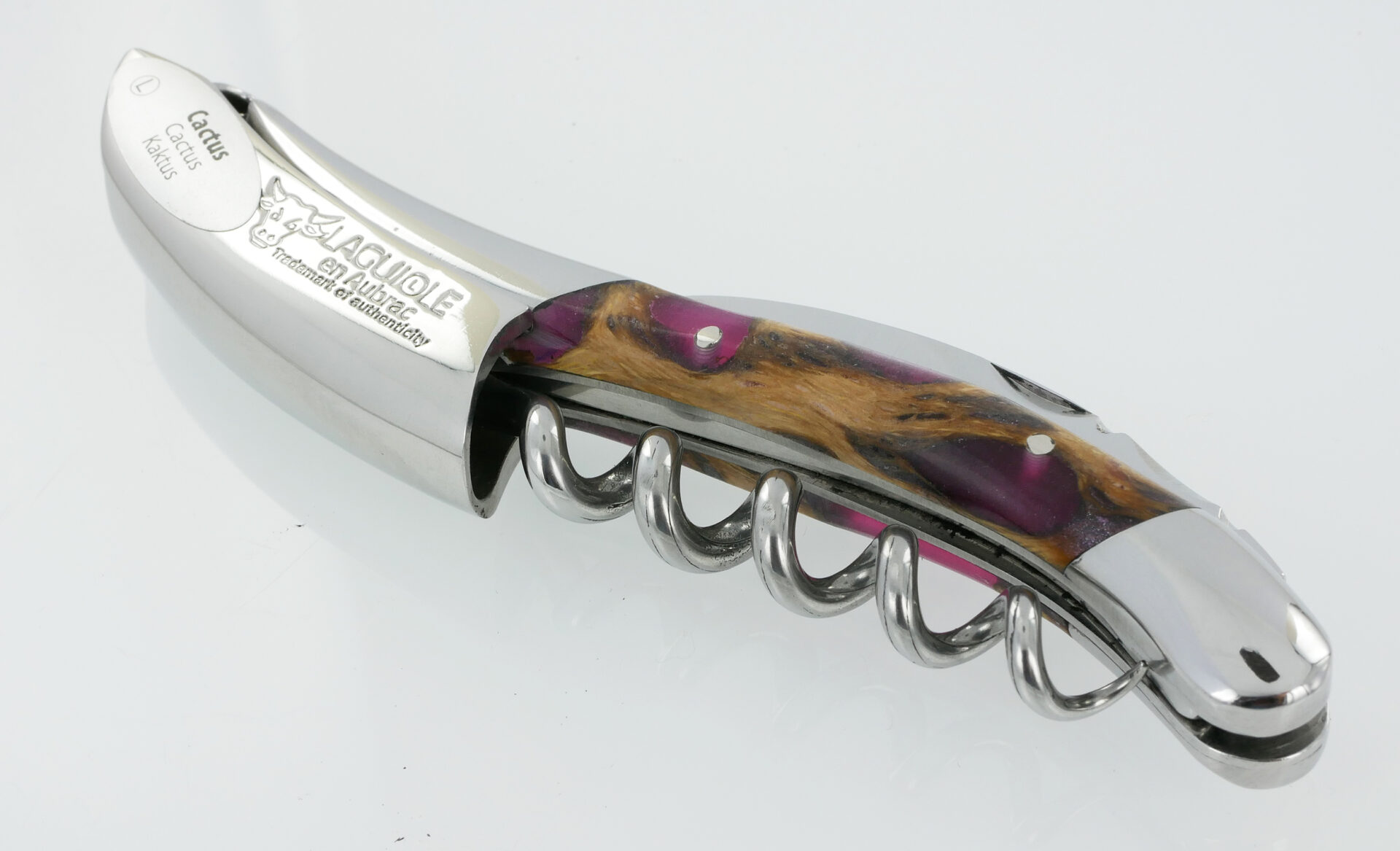 Laguiole en Aubrac Korkenzieher mit Griff aus Fuchsia-Kaktus, poliertem Edelstahl-Finish und einem kompakten Flaschenöffner-Messer aus gebürstetem Edelstahl. Gesamtlänge: 12 cm, Gewicht: 118 Gramm.
