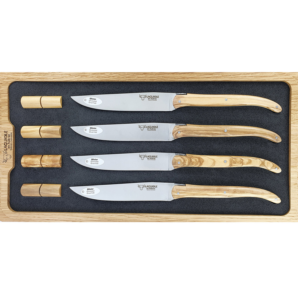 Satz von vier Laguiole Steakmessern mit Griffen aus Olivenholz