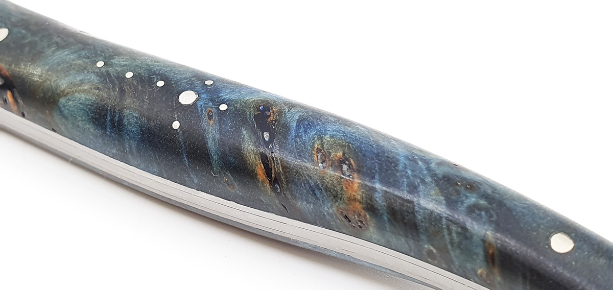 Griffe: Aus blau-grünem Pappelmaserholz gefertigt, mit einem Farbverlauf von Blau zu Grün