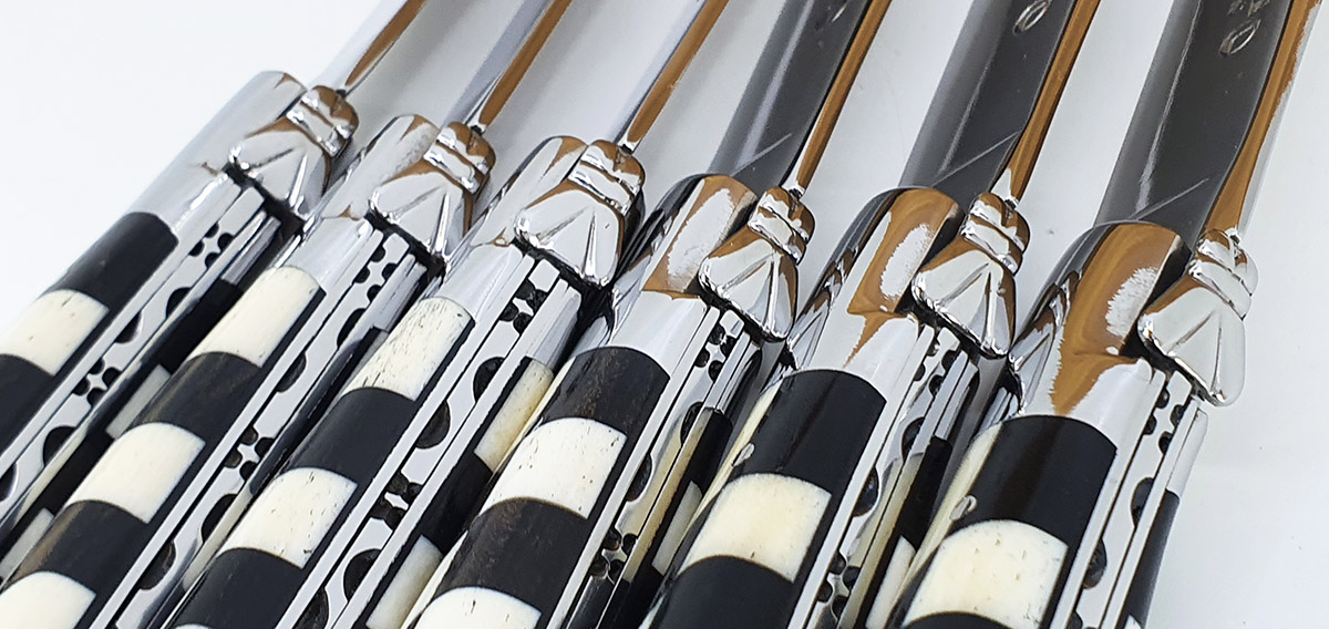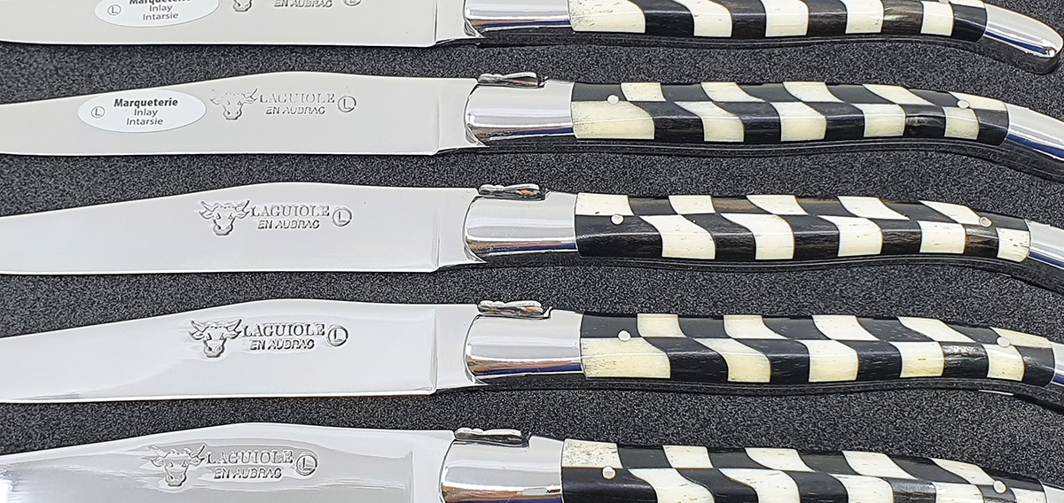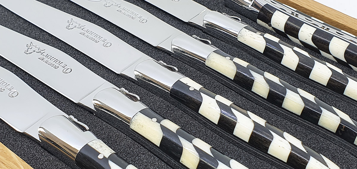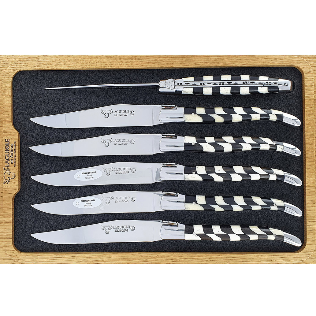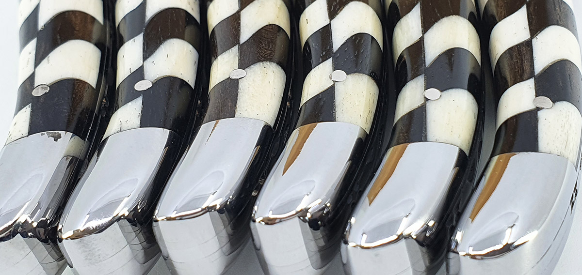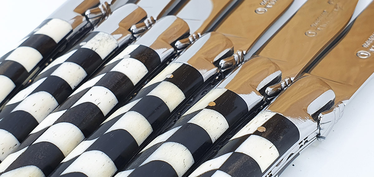 Laguiole en Aubrac Tischmesser Knochen Ebenholz Damier Intarsien Glänzende Backen (Set aus 6)