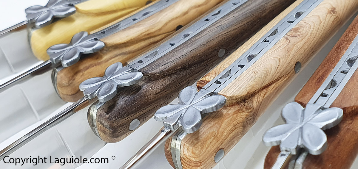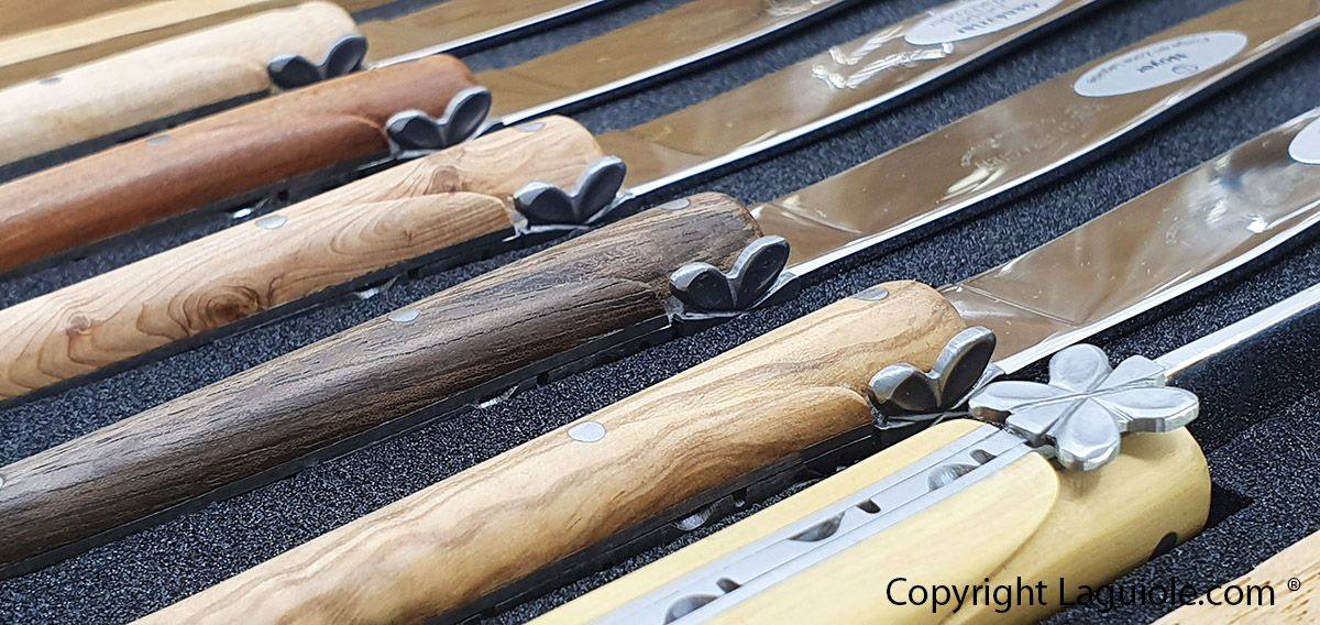 Griffe aus einer Auswahl französischer Hölzer: Walnuss, Olive, Pflaume, Buchsbaum, Wacholder und Apfel.