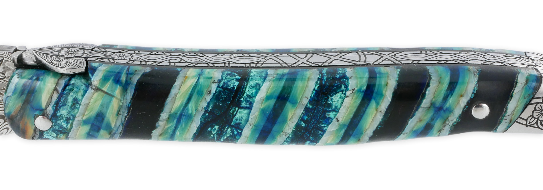 Laguiole Prestige Designermesser 1 Stück 12 cm Rückenbacke Türkis Mammutbackenzahn-Griff Damastklinge Unikat
