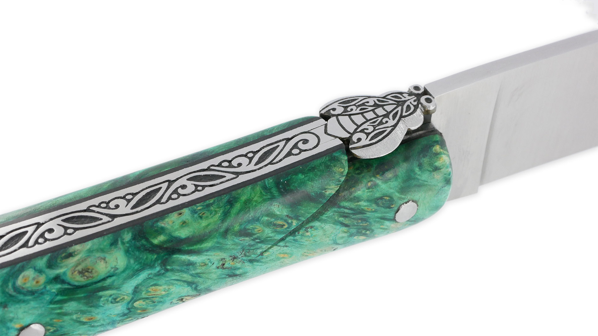Dieses exquisite Klappmesser besticht durch einen Griff aus grün getöntem, stabilisiertem Ahornholz und Mammutelfenbein. Im geschlossenen Zustand misst das Messer 13 cm, geöffnet erreicht es eine Länge von 24 cm. Die Klinge besteht aus gebürstetem 14C28N-Edelstahl, der für seine Langlebigkeit und Schärfe bekannt ist. Die Feder ist kunstvoll von Hand gemeißelt und zeugt von hervorragender Handwerkskunst. Die prestigeträchtige Fliege ist sowohl geschmiedet als auch von Hand gemeißelt, was ihre Einzigartigkeit unterstreicht.