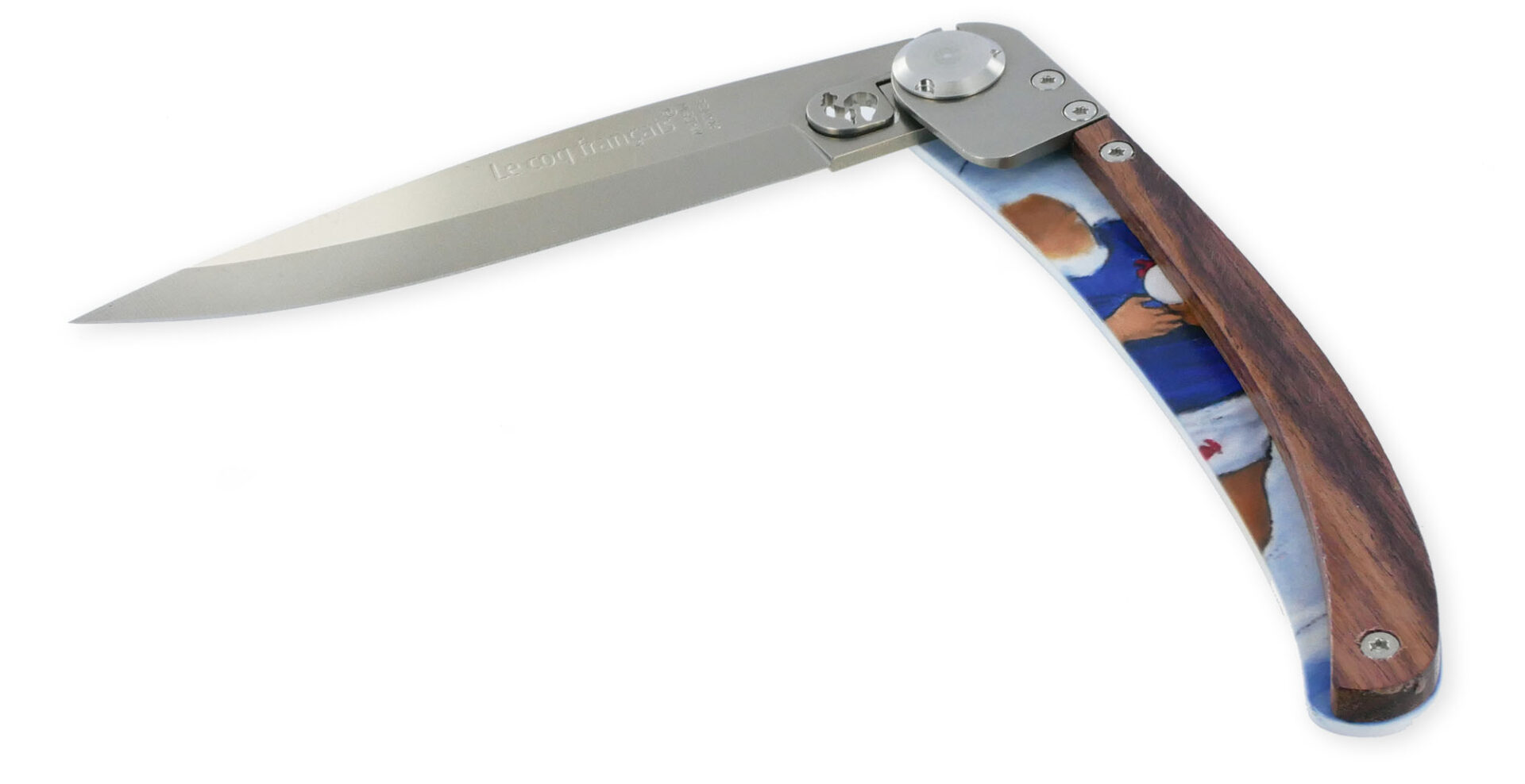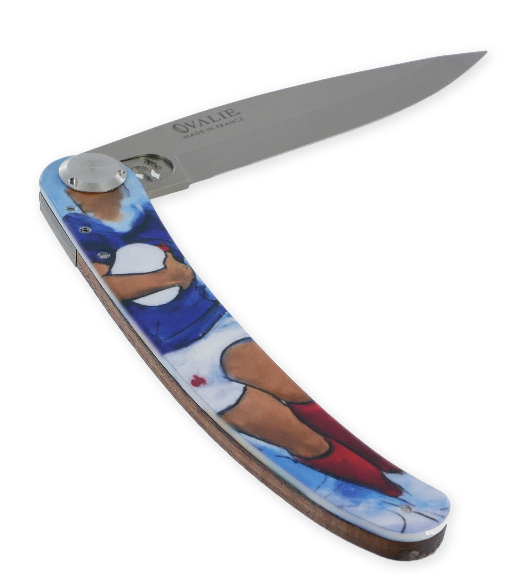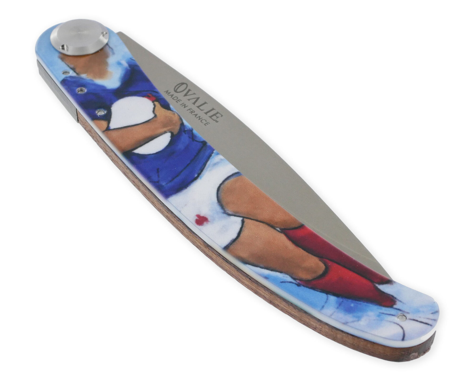 Le Coq Français präsentiert das French Flair Lucie Llong Klappmesser, ein unverzichtbares Stück für Messerliebhaber. Dieses exquisite Messer besticht durch einen Griff aus Veilchenholz, der eine angenehme Handhabung ermöglicht. Die Klinge aus rostfreiem Stahl misst 10 cm, während der Griff 11 cm lang ist, was eine Gesamtlänge von 21 cm im geöffneten Zustand ergibt. Mit einem Gewicht von nur 67 Gramm ist dieses leichte Taschenmesser einfach zu transportieren. Es verfügt über ein patentiertes Klingenverriegelungssystem für eine sichere Nutzung. Der Griff ist auf beiden Seiten mit einem 100% RUGBY-Themenprint verziert, und es besteht die Möglichkeit, eine Lasergravur für eine persönliche Note hinzuzufügen. Stolz in Frankreich hergestellt, vereint dieses Messer Funktionalität mit Stil.