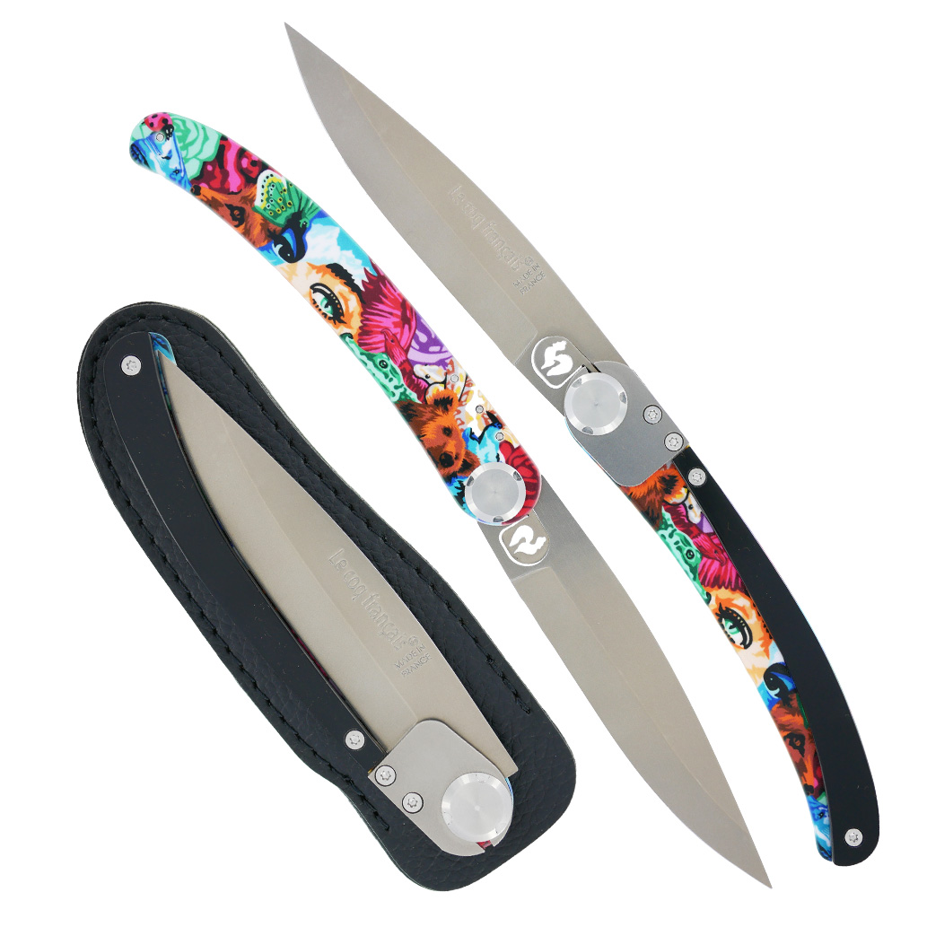 Vorstellung des Le Coq Français Pop Klappmessers von NOKAT, ein unverzichtbares Stück für Messerliebhaber. Dieses exquisite Messer besticht durch einen Griff aus Edelstahl, veredelt mit einer lebendigen Sublimationsfarbbehandlung und glänzenden schwarzen Acrylakzenten. Die Klinge aus Z40C13-Edelstahl garantiert Langlebigkeit und Schärfe.