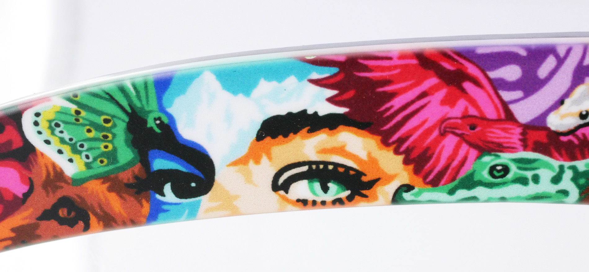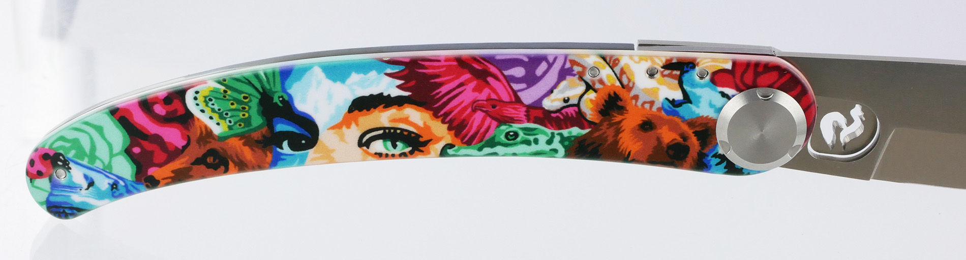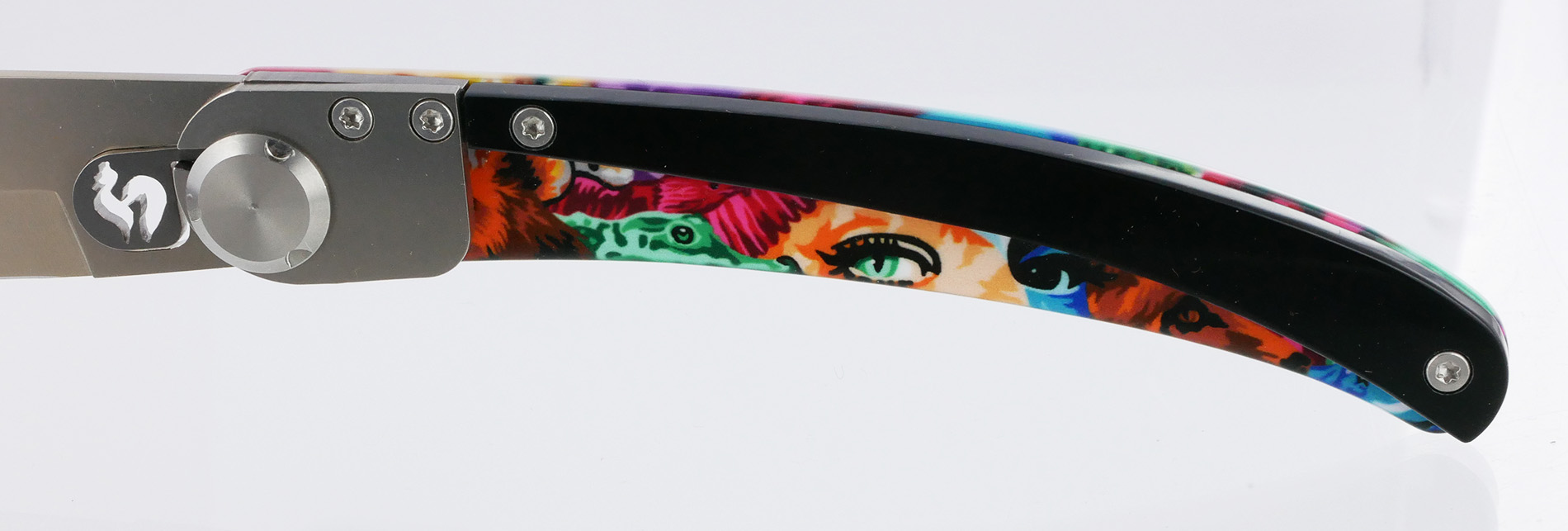 Das Messer verfügt über ein patentiertes Klingenverriegelungssystem für sichere Handhabung und zeigt ein einzigartiges Pop-Art-Design auf beiden Seiten des Griffs. Für eine persönliche Note ist eine Lasergravur möglich.