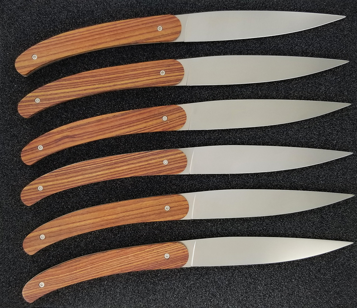 Die Vorderseite jedes Messers zeigt eine schwarze Lasergravur auf dem satinierten Edelstahlgriff, während die Klingen aus hochwertigem Z40 C13 Edelstahl gefertigt sind. Die Rückseite der Griffe besteht aus massivem Kingwood, das sorgfältig von Hand mit Bienenwachs poliert wurde, um eine glatte und elegante Oberfläche zu erzielen.