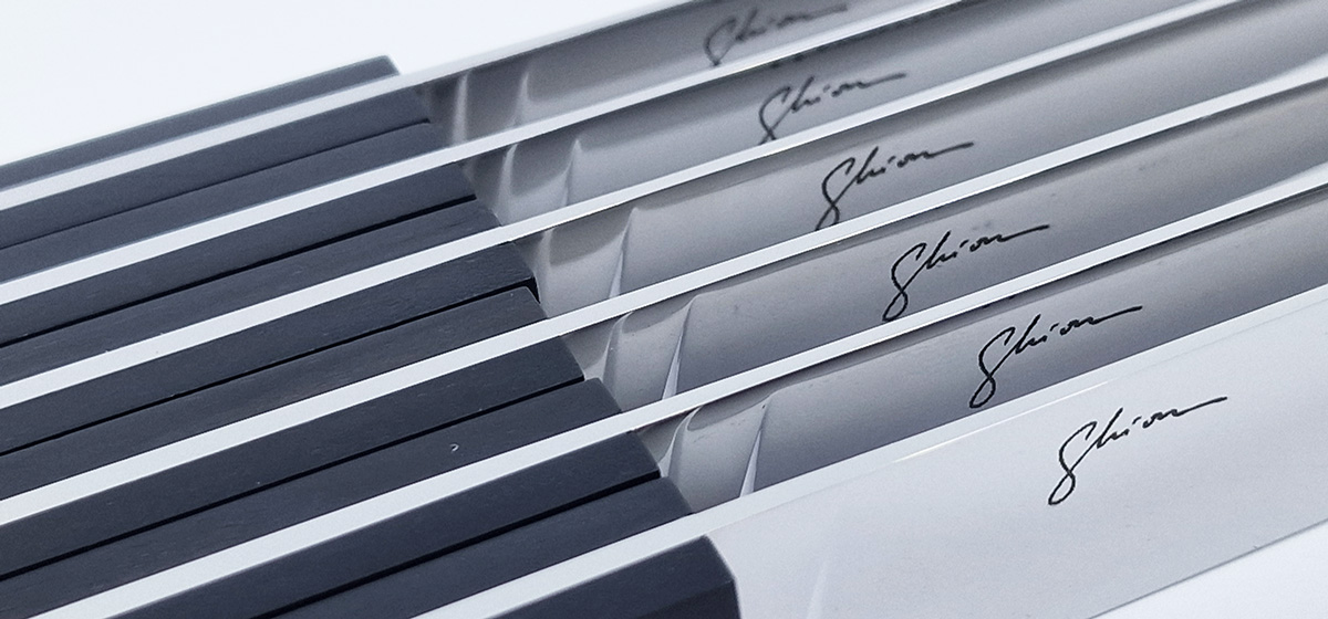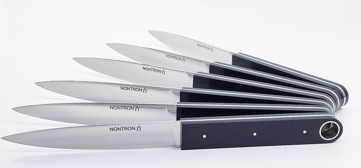 Entworfen von Christian Ghion, verkörpert dieses Tischmesser eine gelungene Symbiose aus modernem Design und den zeitlosen Traditionen des Nontron-Messers. Der Griff aus klassischem Buchsbaumholz, verziert mit der charakteristischen Drei-Punkt-Pyrogravur, weist eine flache Form auf, die sich von den traditionelleren Griffen anderer Modelle abhebt. Durch die Einführung einer kreisförmigen Perforation am Ende, betont durch einen Metallring, verleiht Ghion dem „ältesten Messer Frankreichs“ eine frische, zeitgemäße Note und eine elegante Ausstrahlung.