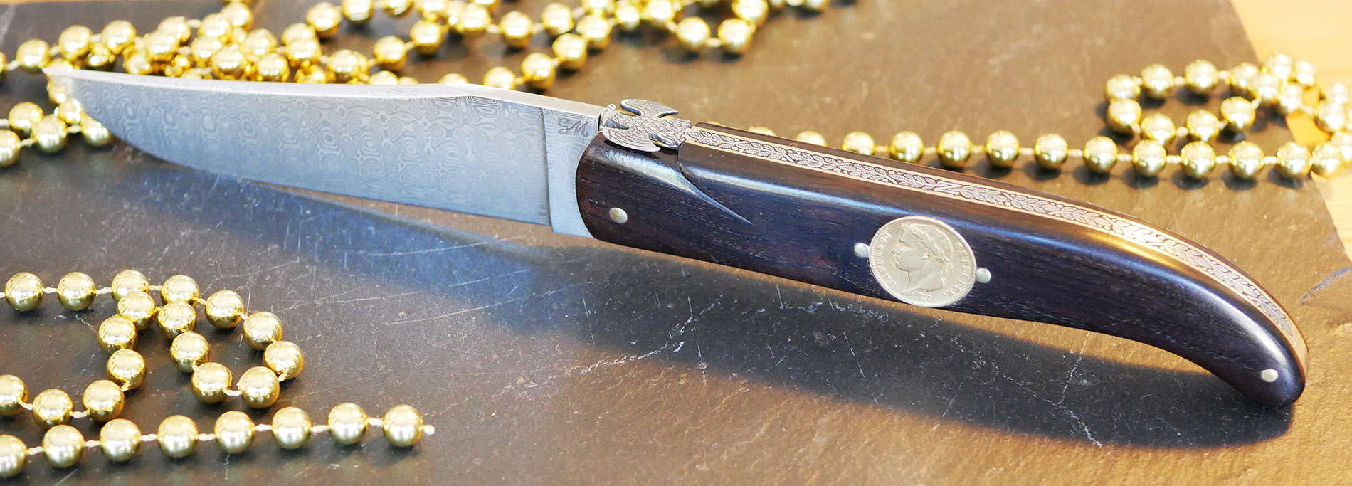 Dieses Messer beeindruckt durch seine Raffinesse und reiche Geschichte. Der Griff, gefertigt aus Mammutelfenbein und Ebenholz, ist mit einer antiken Münze verziert, die das Abbild Napoleons trägt und ein Gefühl von Prestige und Eleganz vermittelt. Mit einer Länge von 15 cm und einem Gewicht von 200 g ist dieses Messer ein wahres Meisterwerk der Handwerkskunst. Die kunstvoll gestaltete Feder, geschmückt mit Lorbeerblättern und Napoleons ikonischem „N“ im Zentrum, zeugt von der Expertise und der akribischen Detailgenauigkeit des Kunsthandwerkers. Dieses Messer vereint Kunst, Geschichte und Funktionalität auf perfekte Weise. Die Ergänzung durch eine Fliege, die einen kaiserlichen Adler darstellt, verstärkt die Pracht dieses bemerkenswerten Stücks zusätzlich.