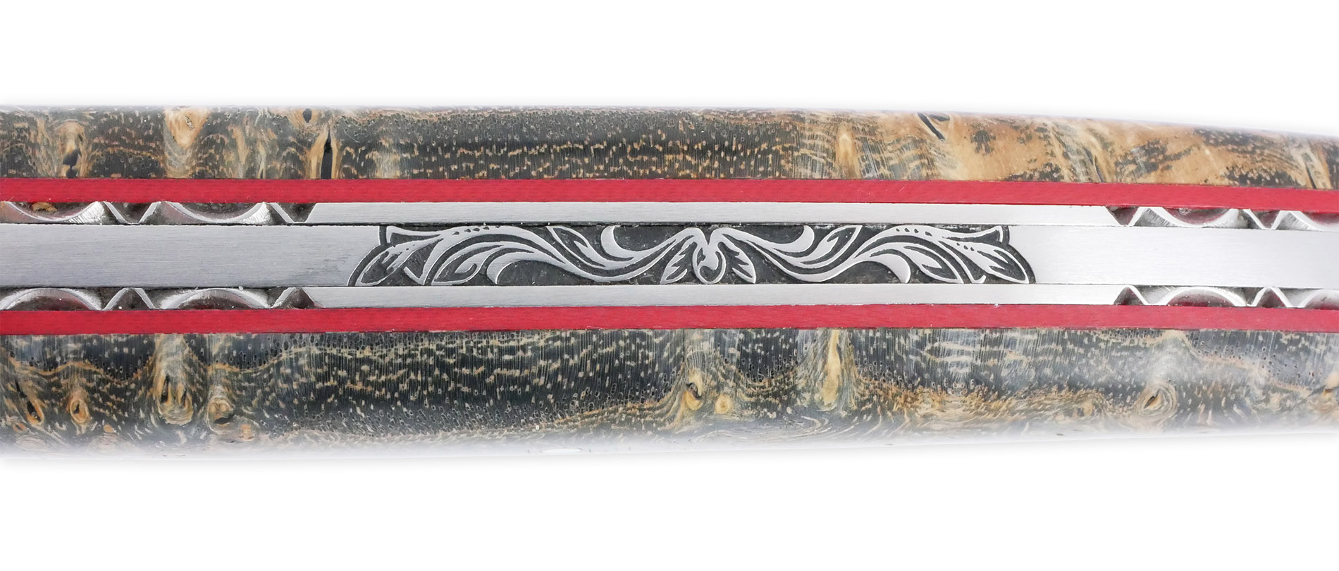Dieses außergewöhnliche Messer besticht durch einen Griff aus atemberaubendem Platanen-Maserholz und ein durchgehendes Hüllendesign. Die Klinge aus Damaststahl kommt ohne Mitre aus und wird von einer handguillochierten Feder ergänzt. Die glänzenden Edelstahlplatinen sind von Hand graviert, und rote Abstandshalter setzen zusätzliche Akzente. Eine stilisierte, handgeschmiedete Biene ziert die Fliege und unterstreicht die hervorragende Handwerkskunst.