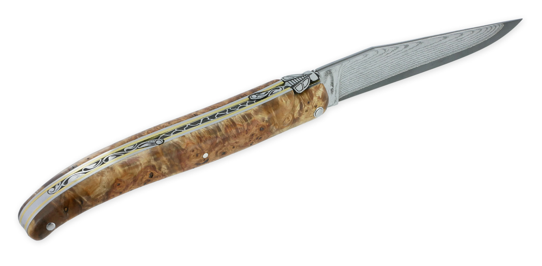 Dieses außergewöhnliche Messer besticht durch einen Griff aus Kastanienholz-Maser und ein durchgehendes Design. Die Klinge aus japanischem Damaststahl bietet herausragende Schärfe und Ästhetik und verzichtet auf ein Mitre für ein elegantes Erscheinungsbild. Die handguillochierte Feder verleiht dem Messer eine zusätzliche Note von Eleganz. Die doppelten Platinen sind sorgfältig aus Edelstahl und Messing von Hand geschmiedet und ziseliert. Eine stilisierte, handgeschmiedete Biene ziert das Messer als charakteristisches Detail.