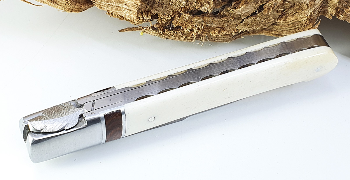 Dieses Messer, speziell für Kenner, besitzt einen Griff aus Knochen und eine Klinge aus 12C27-Edelstahl, die mit einem Öffnungstab ausgestattet ist. Die Klinge hat ein gebürstetes Finish und das Messer verwendet einen Zwangskerben-Verschlussmechanismus für eine sichere Verriegelung. Ein einzelner gebürsteter Edelstahlbeschlag ist ebenfalls vorhanden. Im ausgeklappten Zustand misst das Messer 20,5 cm, wobei der Griff 11 cm und die Klinge 9,1 cm lang sind. Das Gesamtgewicht beträgt 82 Gramm.