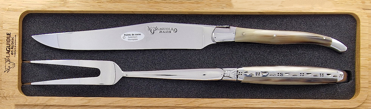 Dieses edle Set besteht aus einem Messer und einer Gabel, deren Griffe aus Hornspitze gefertigt sind.